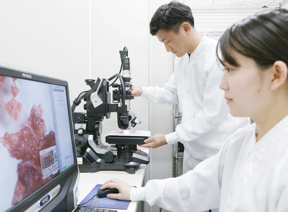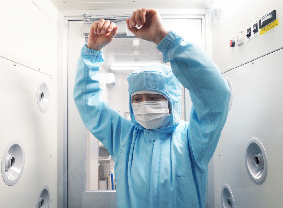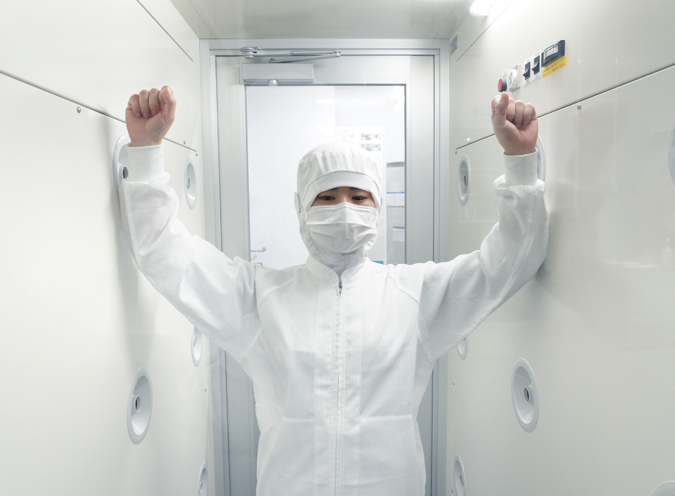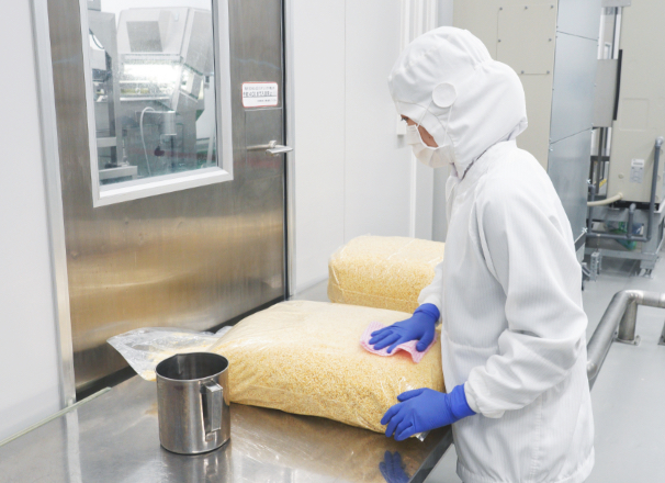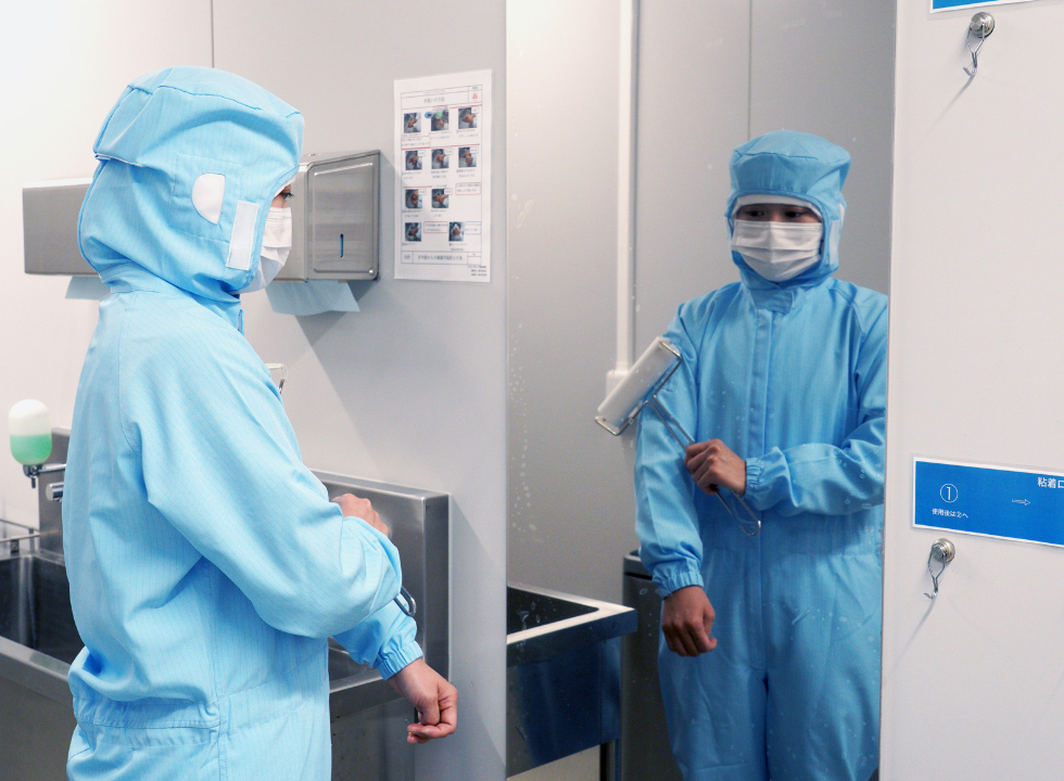 手洗い・アルコール消毒・エアシャワーはもちろん、準備室から選別室に入室する際はさらに二次服を着用する(二重更衣)など原料同様に厳重なルールを守って作業に取り組みます。
